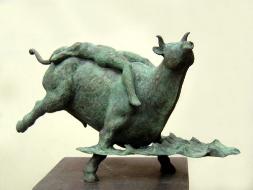 Prinses Europa geeft zich over aan de God Zeus in de gedaante van een stier.Zie hoe triomfantelijk Zeus is dat zijn list is gelukt.